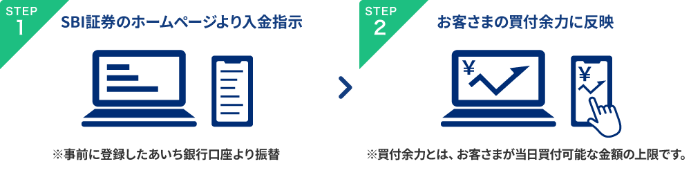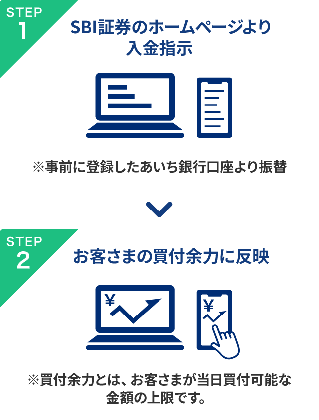 SBI証券のホームページから、あいち銀行の普通預金口座を口座振替登録するだけで、ご利用いただけます。<その他入金方法>