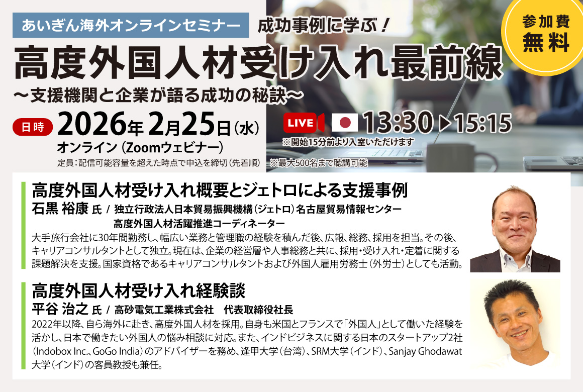 - あいぎん海外オンラインセミナー「成功事例に学ぶ!高度外国人材受け入れ最前線~支援機関と企業が語る成功の秘訣~」