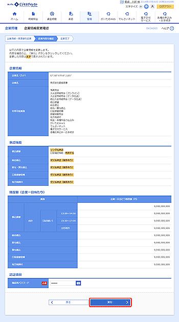 承認機能の利用有無、限度額の各項目を入力し、[変更]ボタンをクリックしてください。