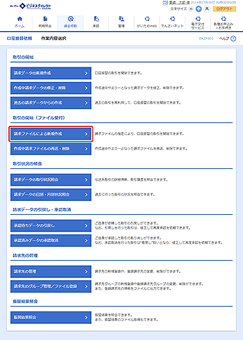 「業務選択」画面が表示されますので、[口座振替依頼]ボタンをクリックしてください。
