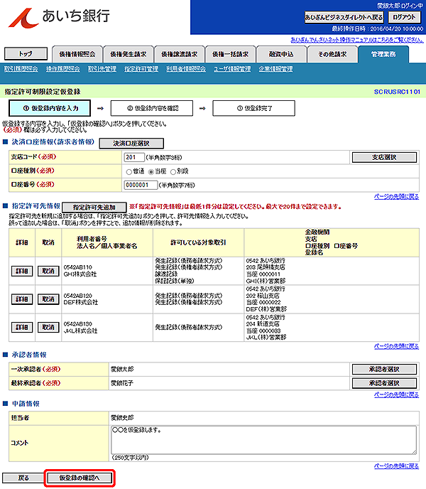 「指定許可制限設定仮登録確認」画面が表示されます。