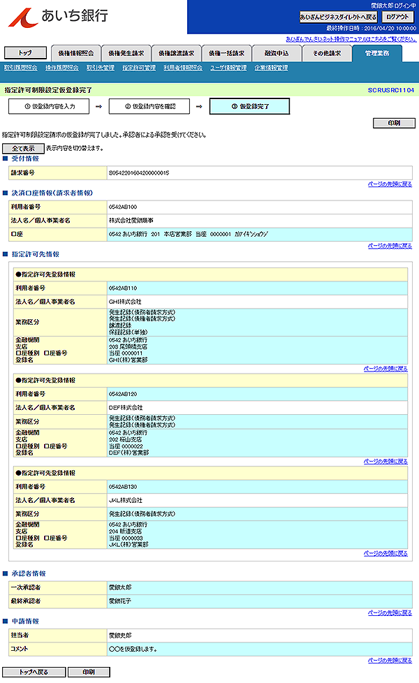 「指定許可制限設定仮登録完了」画面が表示されます。