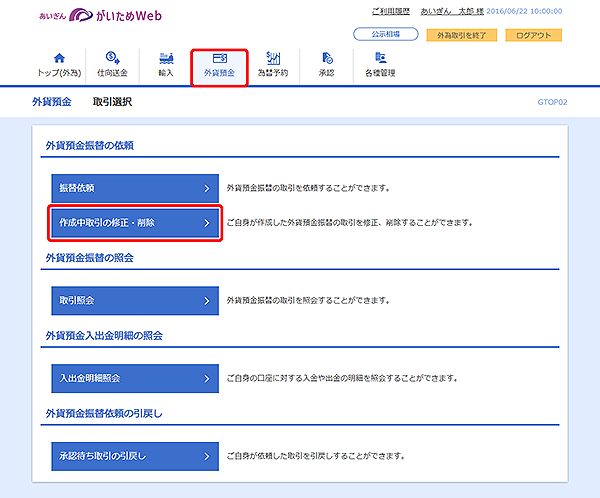 「取引選択」画面が表示されますので、[作成中取引の修正・削除]ボタンをクリックしてください。
