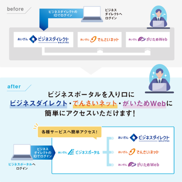 3月2日(月)より法人IBへのログインが、「あいぎんビジネスポータル」(以下、ビジネスポータルと表記します)にログインいただいた後、法人IBにアクセスいただく形へ変更となります。2. ご利用方法
