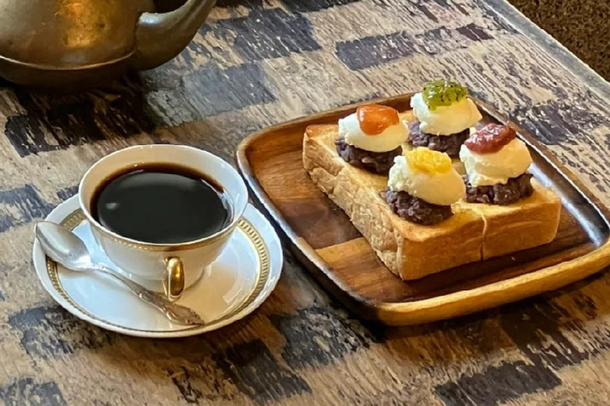 8.自家製フルーツコンフィチュールと小倉あんを重ねた贅沢小倉トースト[コーヒーハウスかこ 花車本店]