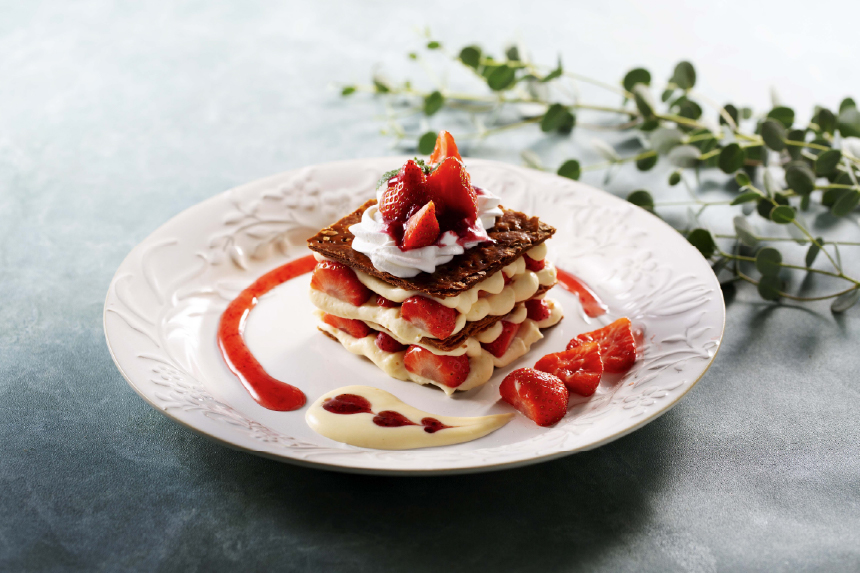 バターの香り豊かな香ばしいパイ生地に、カスタードクリームとイチゴをサンドした苺のミルフィーユ(1,650円)は、パイのサクサク食感とイチゴの甘酸っぱさの絶妙なハーモニーが楽しめます。ほかにも、華やかな季節限定のケーキやパフェ、贅沢なアフタヌーンティーセットなど、心ときめくメニューがたくさん!リッチな雰囲気の中で、自分へのご褒美も兼ねて推し活に利用してみるのもおすすめです。