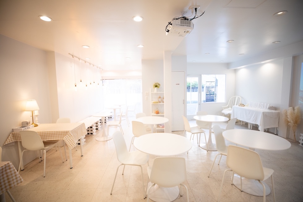 白を基調とした韓国風のおしゃれなカフェ。かわいらしいテーブルクロスが特徴の少人数席もあり、2人での女子会や誕生日会にぴったりの空間です。プロジェクターで推しのミュージックビデオを流せば、まるでライブ会場のような臨場感を味わうこともできます。
