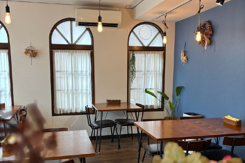 古民家をリノベーションした温もり感じる店内は、アンティーク家具で統一され、心地良いBGMが流れる隠れ家的スポットです。絵本の中にいるようなかわいらしい空間で、お腹も心も満たされるひとときが過ごせます。1階席には、ワンちゃんと一緒に食事やデザートを楽しめる「ワンちゃん席」も!