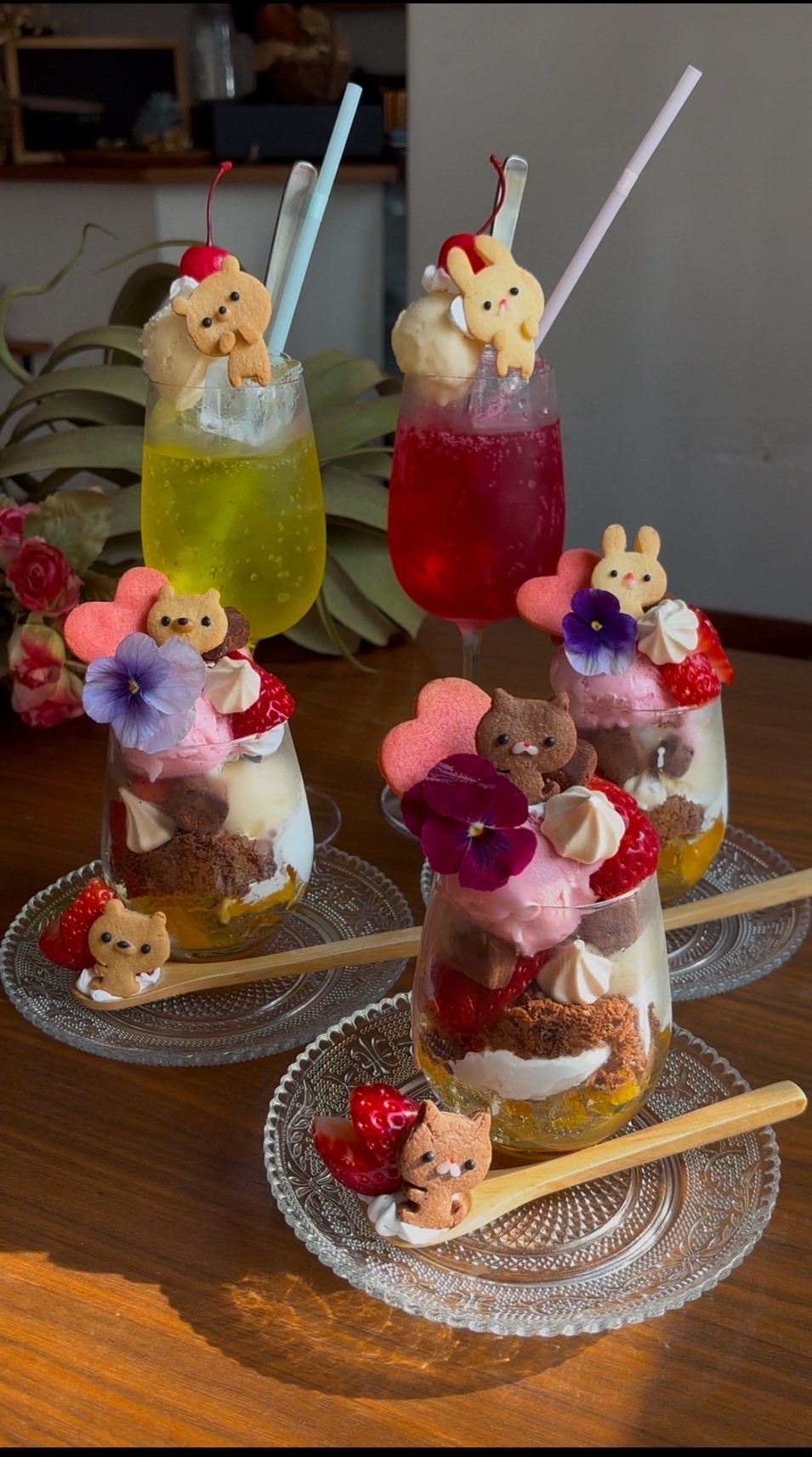 イチゴパフェ(2,300円)、くまキーマカレー(1,650円)、うさぎバターチキン(1,650円)など、動物モチーフのメニューは推し活との相性抜群!期間限定のパフェは赤、青、黄など、リボンを9色の中から選べます。クリームソーダはイチゴやメロン、レモンなどの9種類の味から選べるので、色を統一すればインスタ映えする写真が撮れそうです。
