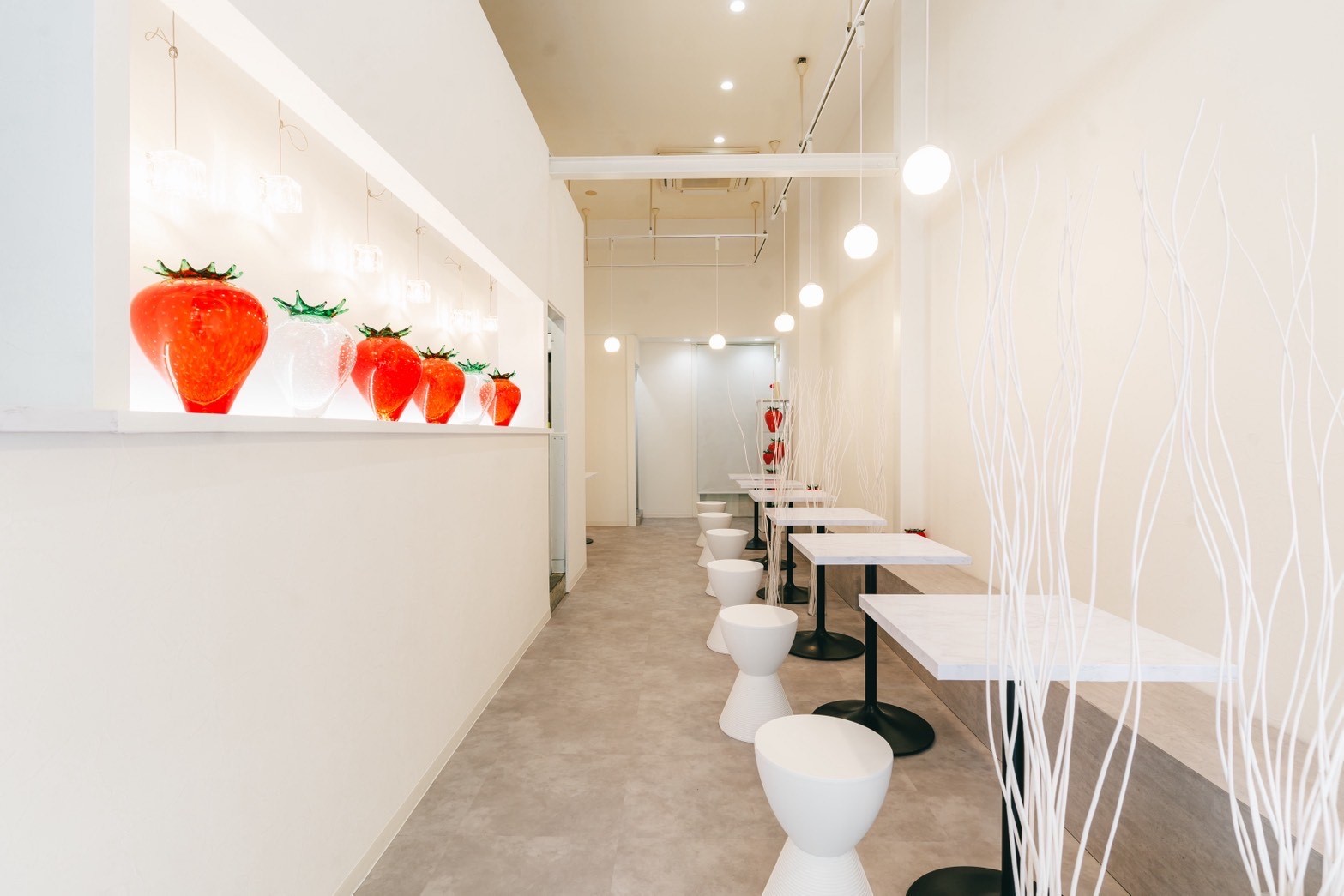 イチゴをメインとしたスイーツが楽しめる、洗練されたお店です。店内は白を基調とし、イチゴモチーフの装飾がアクセントに。大理石調テーブルもあり、落ち着いた雰囲気の中で、カフェタイムを楽しみながら推し活をするのも良いですね。