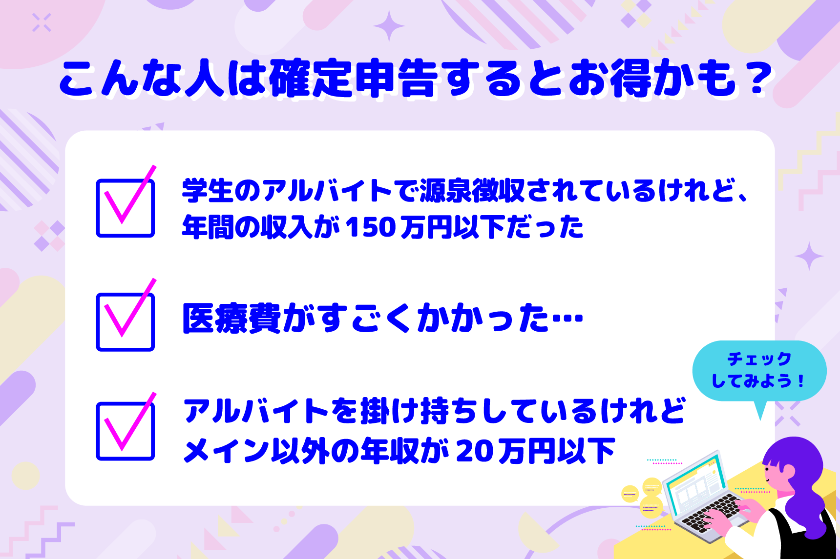 アルバイトの場合、収入や働き方によっては、「確定申告をしなくてもいい」ことがあります。それでも申告しておくと得になることがあります。