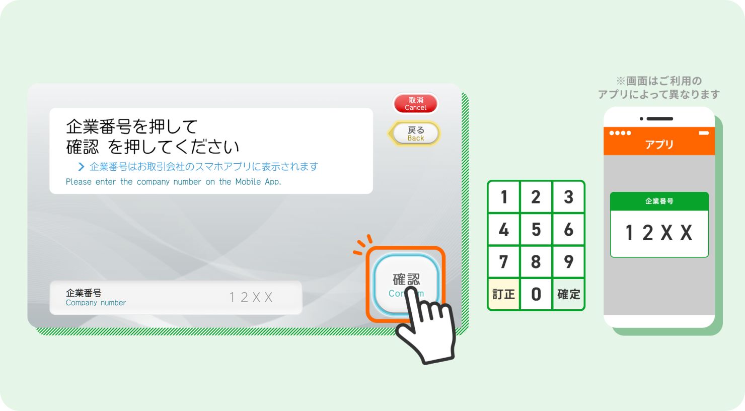 あいぎんアプリに表示された「企業番号」をATM画面に入力し、ATM画面の「確認」ボタンをタッチ